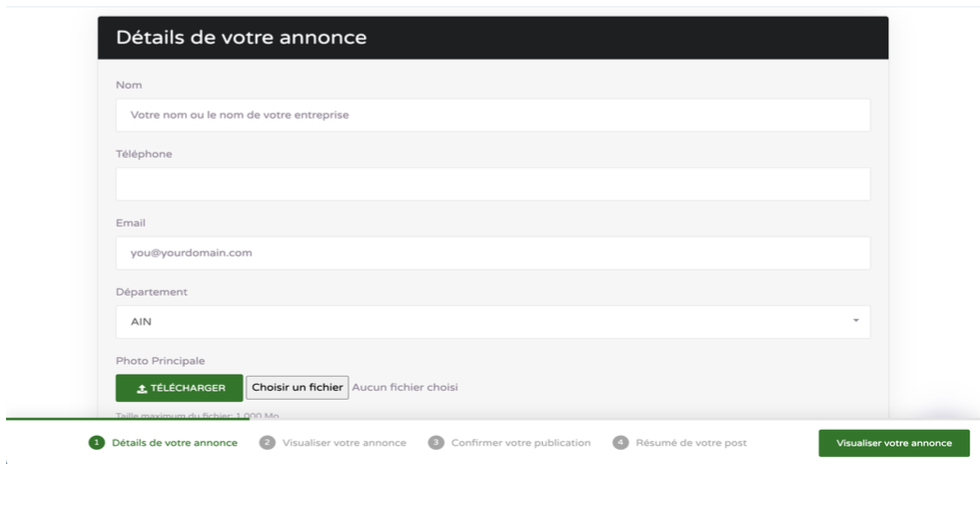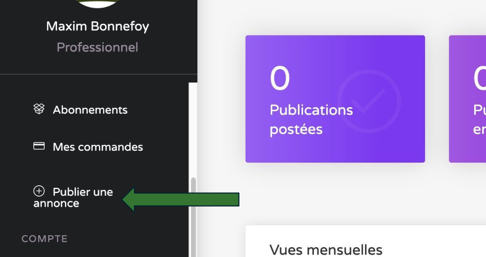 Étape 3 : Une fois les champs renseignés et votre compte crée, vous serez redirigé sur la page de votre profil. Cliquez sur « Publier une annonce », pour être redirigé sur le formulaire de publication d’annonce.